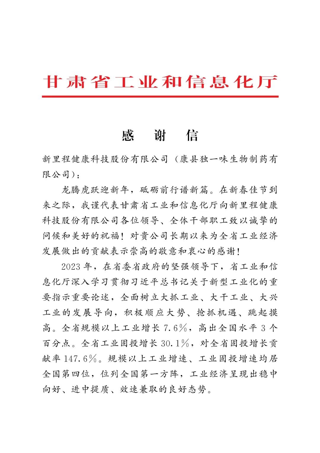 近日,甘肃省工业和信息化厅向太阳成集团tyc138健康科技股份有限公司 (康县独一味生物制药有限公司)发来感谢信,对独一味制药长期以来为甘肃省工业经济发展做出的贡献表示崇高的敬意和衷心的感谢。这一认可不仅是对独一味制药过去一年工作的肯定,更是对独一味制药未来发展的鼓舞和激励。