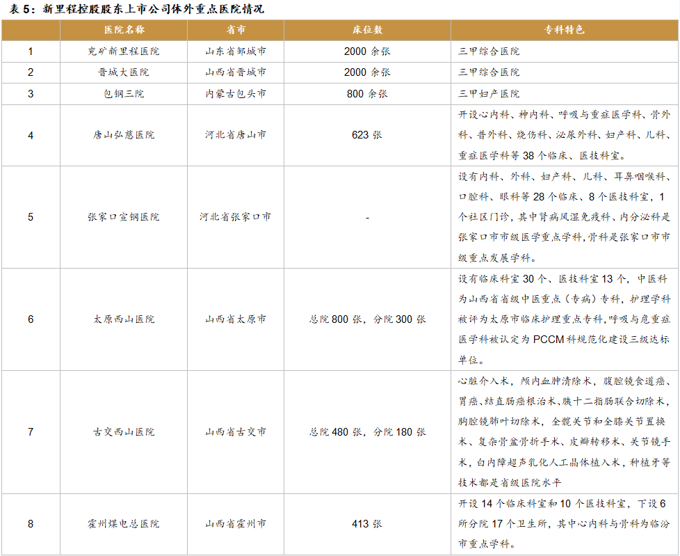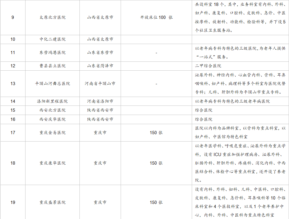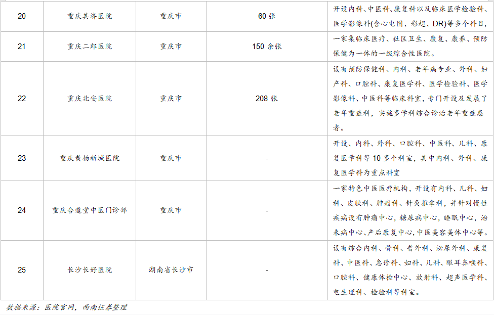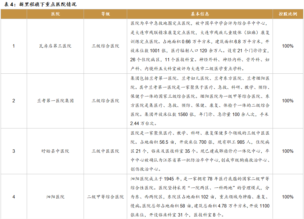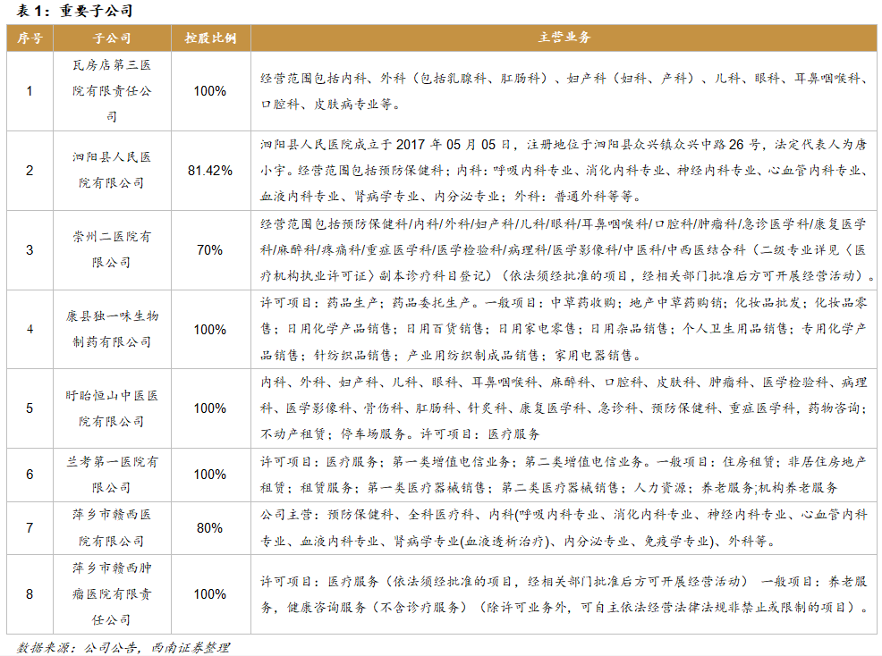 采用“1+N”战略,积极打造领先医疗机构。公司目前控股11家医院,其中瓦房店第三医院、兰考第一医院、盱眙县中医院、泗阳医院、崇州二医院已经成为区域医疗中心,赣西医院和赣西肿瘤医院也是当地排名较高的医疗机构。公司一直采用“一个综合医院+多个专科分院”模式,打造区域领先的医疗机构,致力于肿瘤、骨科、脑血管疾病等领域,顺应老龄化趋势的时代要求。