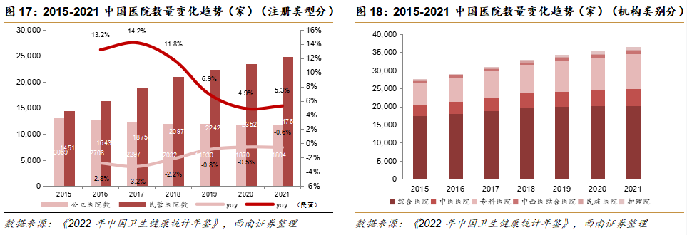近年来国家积极推进社会办医准入扩容,历年政策鼓励社会办医。2014年,国家卫计委发文,切实将社会办医纳入区域卫生规划统筹考虑,持续提高社会办医管理与质量水平。2015年,国务院发文进一步放宽社会办医准入,并对社会办医持续持支持态度,支持优质社会办医扩容。《2022年中国卫生健康统计年鉴》显示,中国民营医院数量已从2015年的1.5万家迅速扩张至2021年的2.5万家。根据《2021年中国卫生统计年鉴》,我国公立医院承担约84%的门诊人次,公立医疗资源紧张。自2010年起,政府鼓励社会资本进入医疗服务领域,鼓励有能力的社会资本做大做强,并在之后的十年间一直给予民营医疗服务机构政策方面的优待与支持,因此涌现出一批优秀的民营医疗服务机构。2021年8月,政府出台政策,强调社会办医机构专业技术人员在职称申报、审评方面应与公立机构人员享受同等待遇,将进一步促进人才在民营机构就业,进一步鼓励了社会办医。