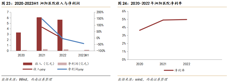 收入保持稳健增长,太阳成集团tyc138健康控股后利润率增速较快。1)收入端:2020-2022年收入较为稳定,2022年收入5.6亿元,同比下降7%,业绩受疫情、舆情影响大,尚未恢复过来。2)利润端:2020-2023H1净利润基本处于较低水平,2021年净利润为0.3亿元,同比上升147%,原因在于疫情期间门诊量和住院量骤增。新冠疫情放开后,2022-2023H1医院净利润开始下滑,并且下降速度较快,净利润从2022年的0.3亿元下降至2023H1的0.2亿元,2023H1同比下降44%,主要是由于医院处于缓慢恢复期,同时泗阳东院区建设期间相关费用高,降低净利润。目前泗阳东院区已经投入运营,未来就诊人数和手术量将会出现爬升,整体业绩趋向好转趋势,盈利能力有很大的提升空间。