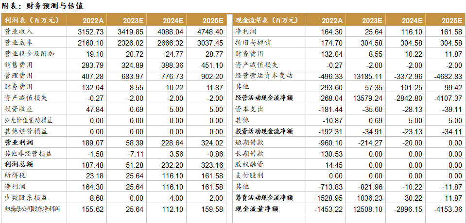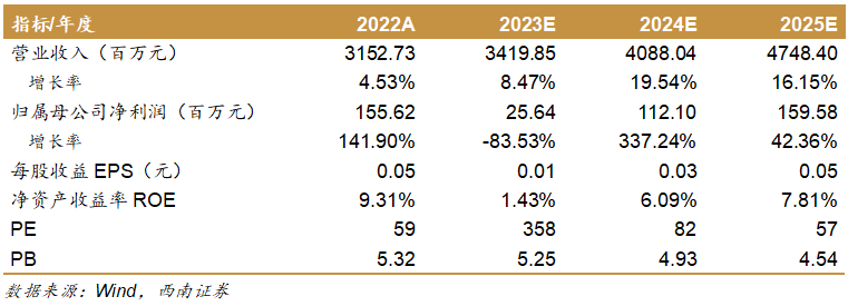 预计2023-2025年公司收入分别为34.2亿元、40.9亿元、47.5亿元,增速为8.5%、19.5%、16.2%;归母净利润分别为0.3亿元、1.1亿元、1.6亿元,增速为-83.5%、337.2%、42.4%。对应EPS分别为0.01元、0.03元、0.05元,建议积极关注。