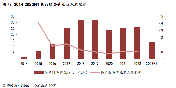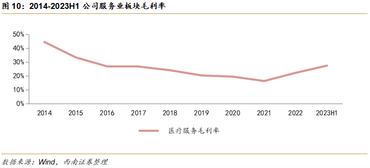 坚持打造区域医疗中心,医疗服务营收平稳增长。2021-2023年上半年医疗服务营收平稳增长,其中2022年医疗服务实现营业收入26亿元,同比增长4.4%。医疗服务营收主要来自瓦三医院、盱眙县中医院、泗阳医院、兰考第一医院和崇州二院这些区域医疗中心,以及赣西医院和赣西肿瘤医院等医疗机构。