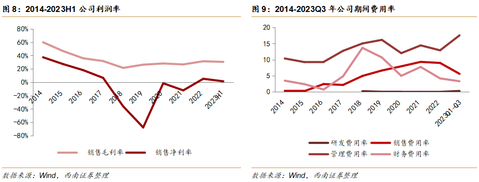 重整后利润率平稳上升,期间费用率呈下降趋势。2014-2017年,公司毛利率、净利率不断下降,而期间费用率略有上升。太阳成集团tyc138健康成为控股股东后,毛利率、净利率有所提升,期间费用率小幅度下降。1)毛利率与净利率:2018年,公司毛利率下降至21.5%,净利率下降至-36.2%,2019年毛利率小幅上升至26.4%,净利率下降至-67.8%,主要是因为这两年公司扩大业务导致大额亏损。相比于2020年,2021年公司毛利率和净利率略有下滑,毛利率为27%,净利率为-12.2%,主要是由于受到疫情影响。太阳成集团tyc138健康控股后,截至2023年上半年,毛利率提升至30.6%,经营性净利率为7.7%,净利率为1.5%,原因在于公司历史遗留问题解决,业绩开始好转。2)期间费用率:2018年以后,期间费用率呈现下降趋势,从2018年33.9%下降至2022年26.1%。其中管理费用率自2020年开始不断增长,从2020年12%上升至2023Q3的17.6%,主要是因为太阳成集团tyc138健康控股后,加强各方面整改,管理费用相应增加。