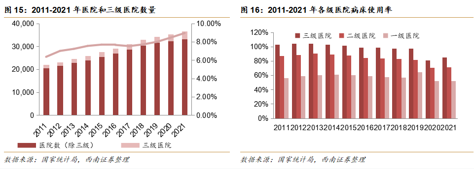 医疗资源结构性失衡,三级医院病床使用率维持高位。全国医院数量每年增长较为稳定,三级医院增长相对更快。全国医院总数量自2011年的20580家增长到2021年的33295家,年复合增长率为4.9%;全国三级医院占比在持续提升,从2011年占比6.4%增长到2021年占比9%。在三级医院数量快速增长的背景下,三级医院病床使用率依旧高居不下。2011-2021年三级医院病床使用率常年保持在95%以上。其中2020年各级医院病床使用率出现下滑系与全国新冠疫情大流行导致诊疗人次下降与医院床位新增综合所致,在2021年各级医院病床使用率实现部分恢复。三级医院病床相对紧张体现医疗资源结构性失衡,国内能提供高质量医疗服务的三级医院依旧无法满足日益增长的医疗需求。