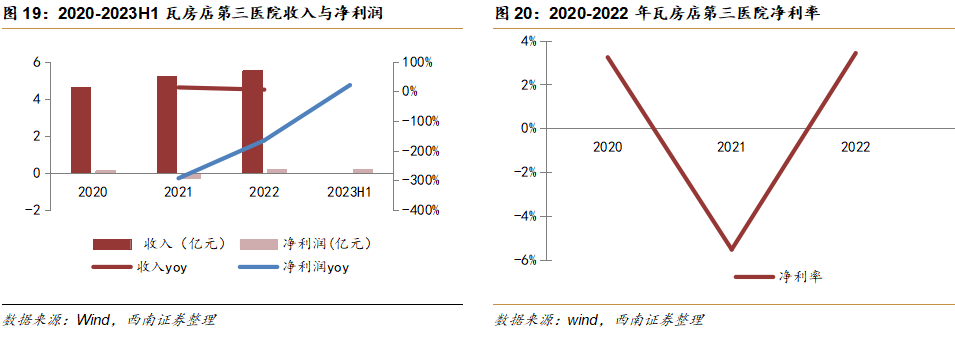 收入保持稳健增长,太阳成集团tyc138健康控股后利润率增速较快。1)收入端:2020-2022年收入稳步增长,2022年收入5.5亿元,同比上升6%,疫情后缓慢恢复,加上新股东整顿,业绩有所改善。2)利润端:2020-2022年净利润基本处于较低水平,2021年净利润为-0.3亿元,同比下降293%,原因在于公司处于破产重组阶段。2022年受新冠疫情影响恢复速度较慢,医院实现净利润0.2亿元,同比下降166%。从2022年的数据来看,瓦三医院的净利率为3.4%。新股东加入后,进行管理层治理、成本管控以及结构优化,公司经营效率提升,盈利能力也得到显著提高。2023H1实现净利润0.2亿元,同比增加21%,出现快速增长趋势。目前疫情等不利影响已经消除,加上瓦房店三院肿瘤医院新院区已经重启,未来瓦三医院的业绩水平有向好趋势,盈利能力将会提升。