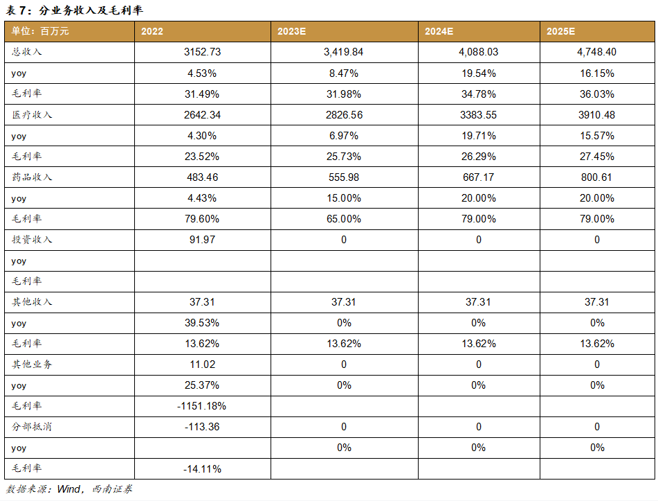 假设2:公司医疗服务板块中盱眙中医院,赣西医院单床产出爬升,2023-2025年增速为5%/3%/3%,其中盱眙中医院床位使用率恢复且提升,2023-2025年床位使用率为90%/92%/94%,赣西医院床位使用率为85%/87%/89%;