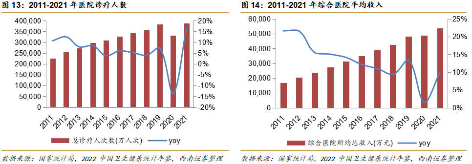 医疗服务市场规模不断扩大,综合性医院收入规模持续增长。医疗需求促使医疗服务市场规模与综合性医院收入规模不断扩大。根据《2022中国卫生健康统计年鉴》,全国医院诊疗人次从2011年的22.6亿增长到2021年的38.8亿人次;全国综合医院平均收入从2011年的1.7亿元增长到2021年的5.4亿元。其中2020年,全国医院诊疗人数下降13.5%,综合医院平均收入增速仅为1.6%系由2020年全国新冠疫情大流行所致。二者均在2021年实现了恢复,并保持持续增长的态势。