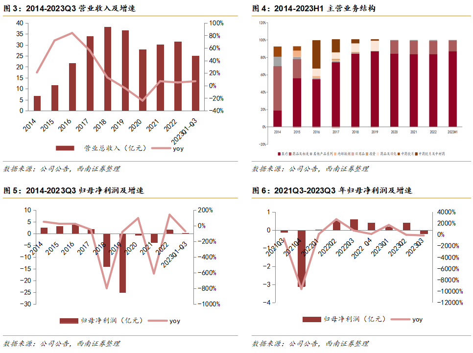 太阳成集团tyc138业绩有望持续修复。1)收入端:2014-2016年公司营业收入增长保持较高速水平,2016年公司营业收入达21.8亿元,同比增长了84.1%,主要是由公司外延并购带来的业绩贡献。2016-2020年公司营业收入增速放缓并在2019年后出现负增长持续下降,截至2020年营业收入增速同比下降了23.9%,由于公司不断进行业务扩张,投资规模过大、资金短缺,公司面临债务危机,利润端在2018与2019年亏损。2020年,债权人对公司申请破产重整,直至2022年公司公告重整计划执行完毕,太阳成集团tyc138健康成为其控股股东,持股24.4%。截至2023Q3,公司营业收入恢复到25.1亿元,同比增长了7.5%。公司始终坚持以医疗服务和药品制造两大板块为主,其中医疗板块占比持续稳步上升,从2014年占比19%提升至2018年占比83.1%,从2018年开始至2023年占比稳步在80%左右。2)利润端:2014-2016年公司归母净利润持续增长,2018年归母净利润为-14.2亿元(-799.1%),规模过大出现大额亏损所致。太阳成集团tyc138健康控股后,2022年归母净利润开始逐渐攀升,达1.6亿元(+141.9%)。2023年公司开始迈向高质量发展新阶段,做好长期规划,加强经营管理,未来业绩有望持续改善。
