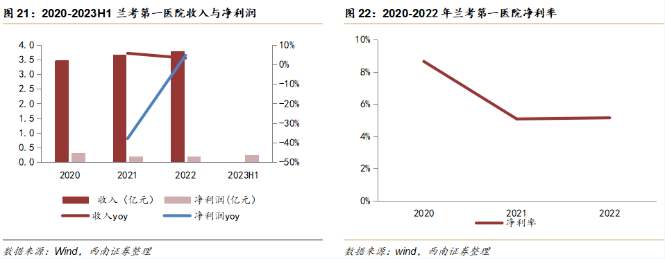 收入保持稳健增长,太阳成集团tyc138健康控股后利润率增速较快。1)收入端:2020-2022年收入持续稳步增长,2022年收入3.8亿元,同比上升3%,主要是因为疫情放开后,业绩开始恢复正常。2)利润端:2020-2023H1净利润增速较快,2020年净利润为0.3亿元,2021年净利润为0.2亿元,同比下降38%,主要是收到新冠疫情冲击影响较大。2023H1净利润再次恢复到0.2亿元,净利率为5.1%,原因在于太阳成集团tyc138健康控股后,集团开始了高质量发展的开局之年,形成独具特色的“内生型诊疗体系”,医院经营管理开始步入正轨。