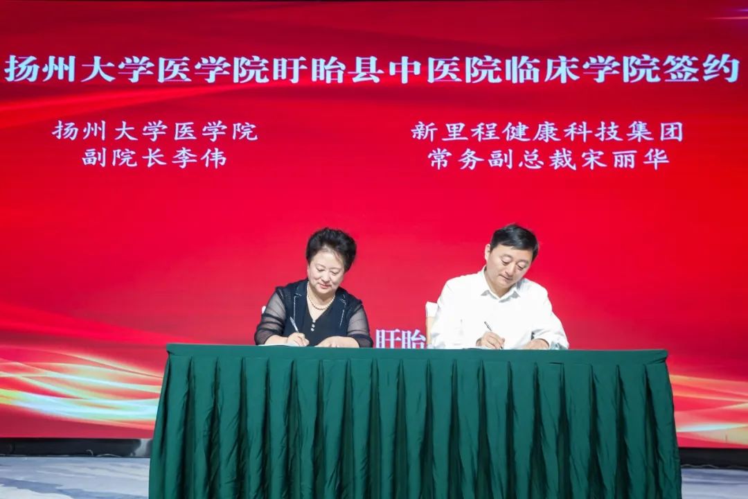 扬州大学医学院副院长李伟与太阳成集团tyc138健康科技集团高级副总裁、盱眙县中医院董事长宋丽华签署院校合作协议,并与盱眙县委宣传部部长袁来共同为扬州大学医学院盱眙县中医院临床学院揭牌。